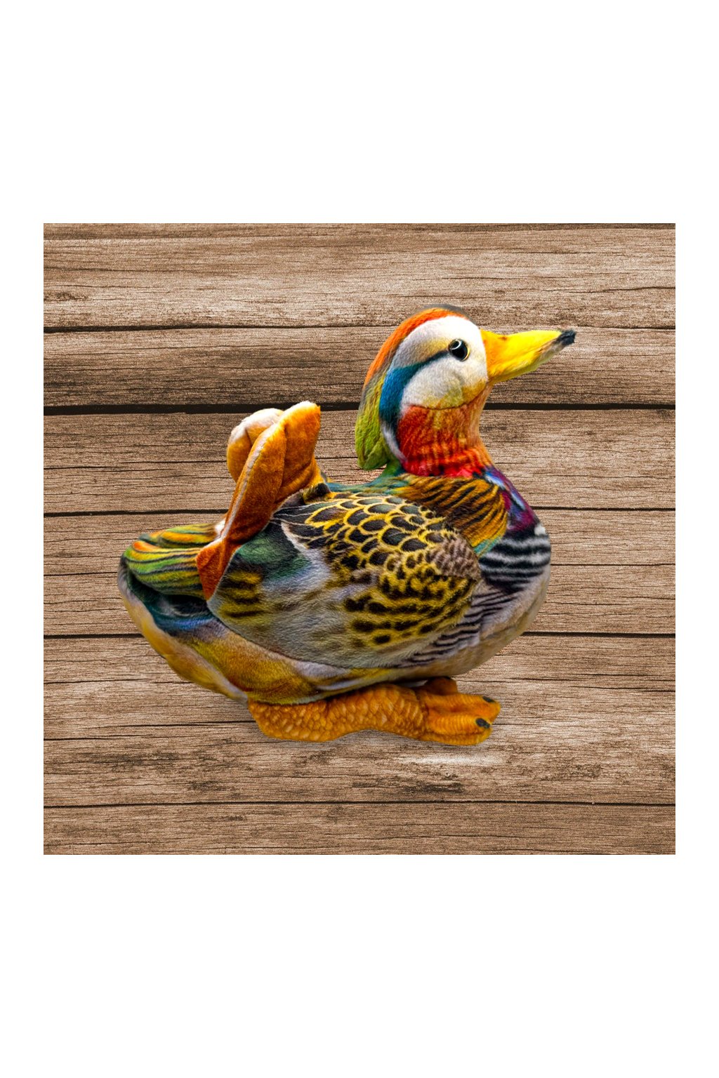 Realistická plyšová kachnička mandarinská ze speciálního materiálu s detailním potiskem – věrné zpracování tohoto exotického ptáka.
